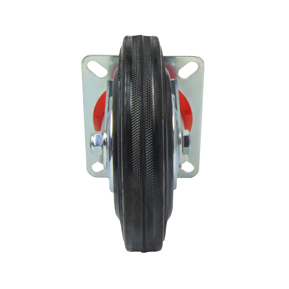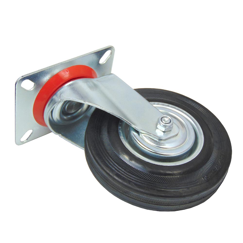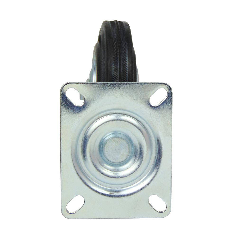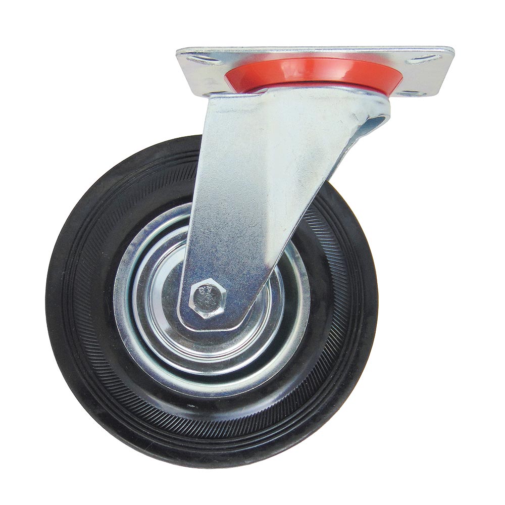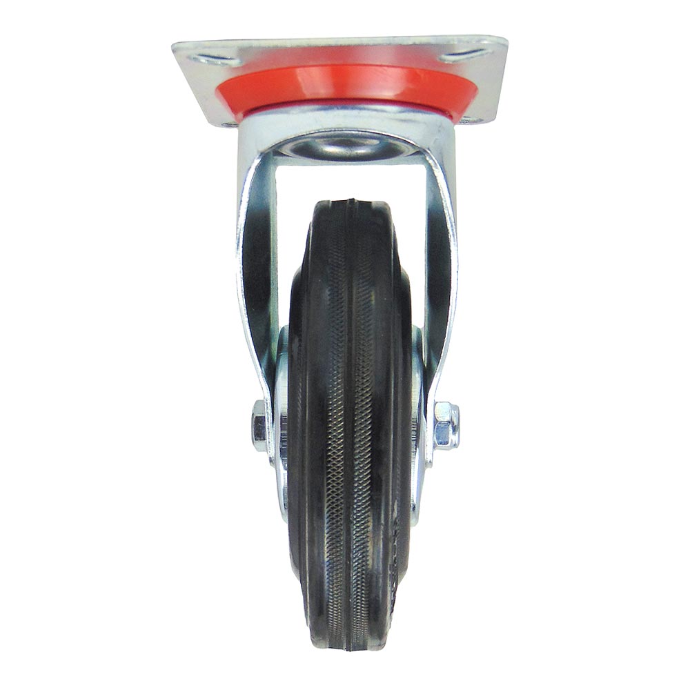 Для плавного перемещения по различным поверхностям используется шинка из черной резины. Ось колеса оборудована надежным роликовым подшипником, а механизм поворота кронштейна оснащен двухрядным шарикоподшипником с защитой от пыли из пластика.