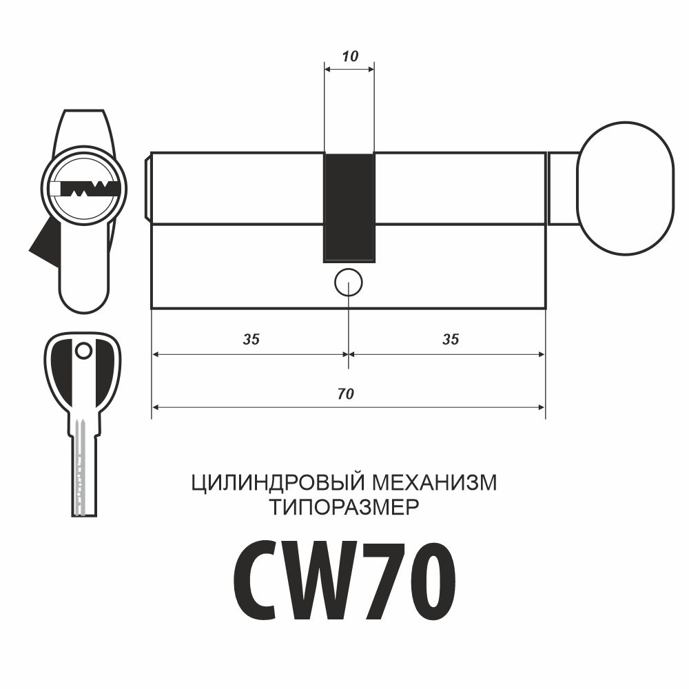 Для комплектации врезных замков, размер - 70 мм, типоразмер цилиндра - 35/35, 5 перфоключей, отклонение кулачка на 30 градусов защищает от выбивания. Материал - латунь.