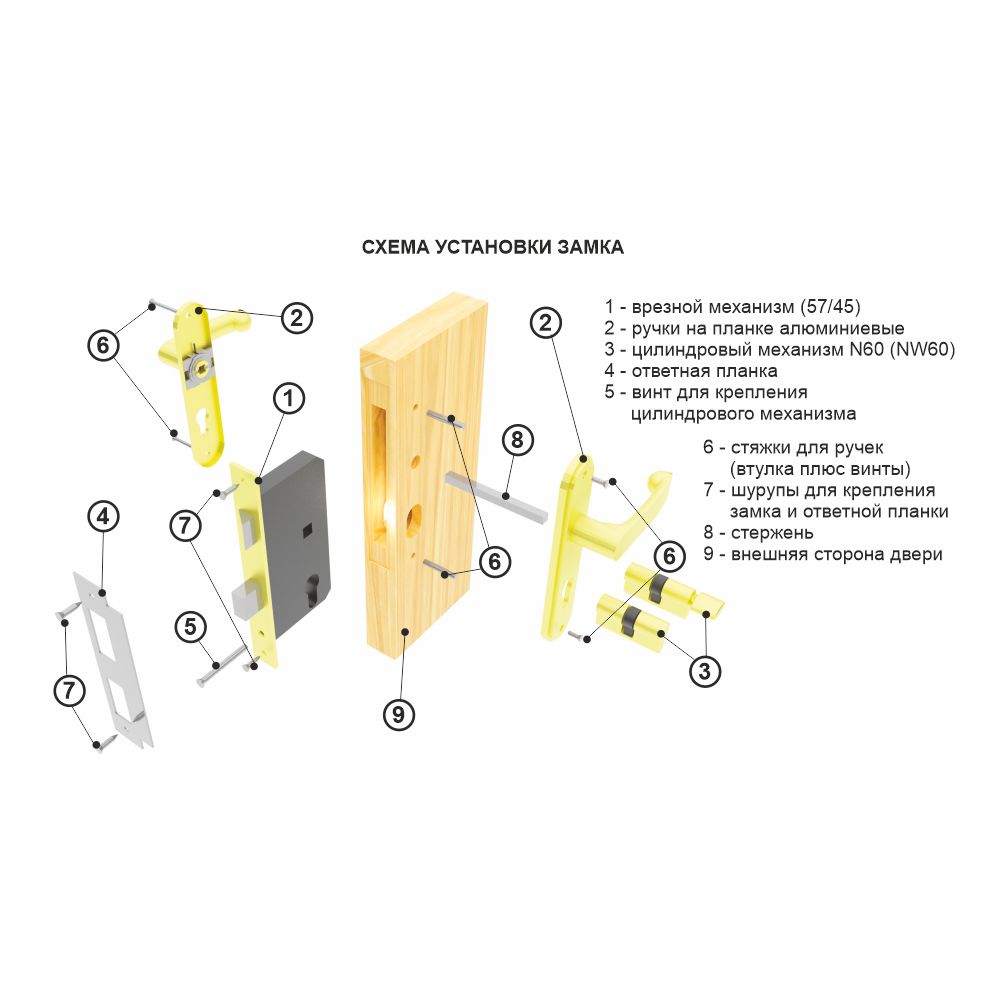 Ручки на планке, врезной механизм с универсальной защелкой и прямоугольным ригелем, цилиндровый механизм 66 мм ключ-ключ с 3 английскими ключами