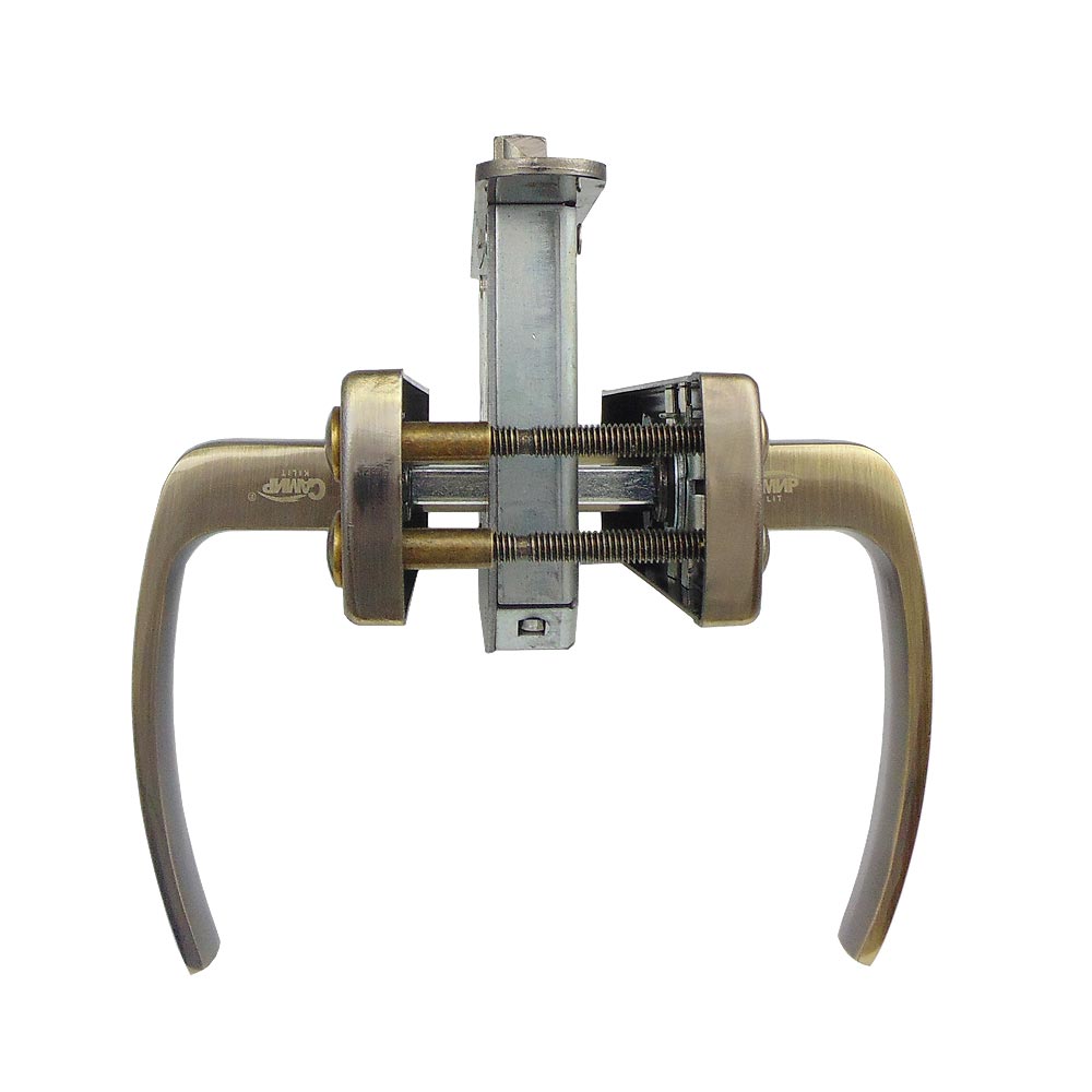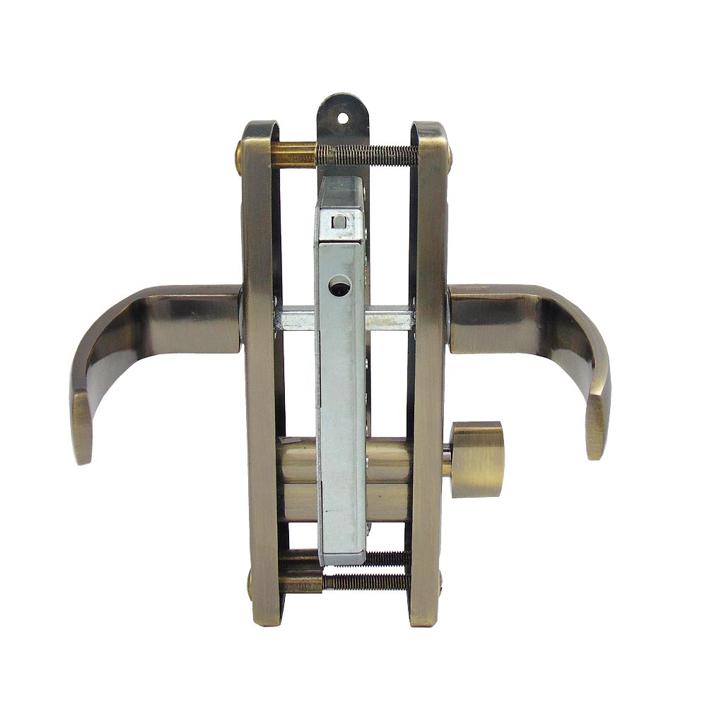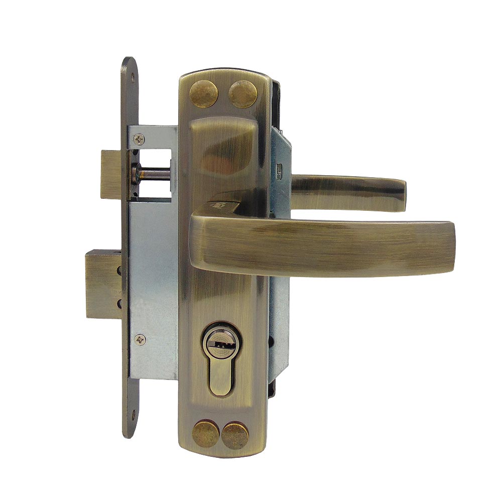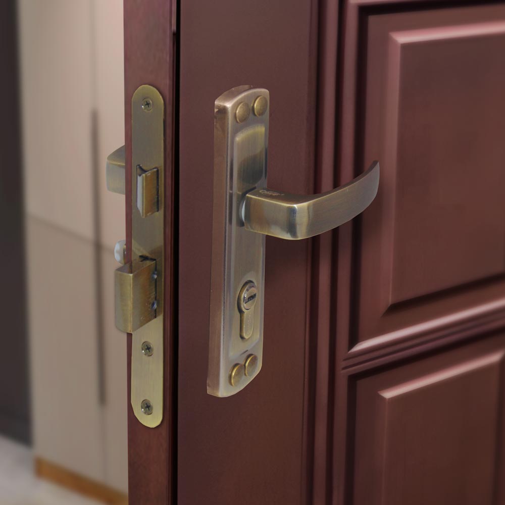 Замок врезной цилиндровый с верхней реверсивной защелкой и фалевыми ручками универсальный. Цилиндрового механизма в комплекте нет.