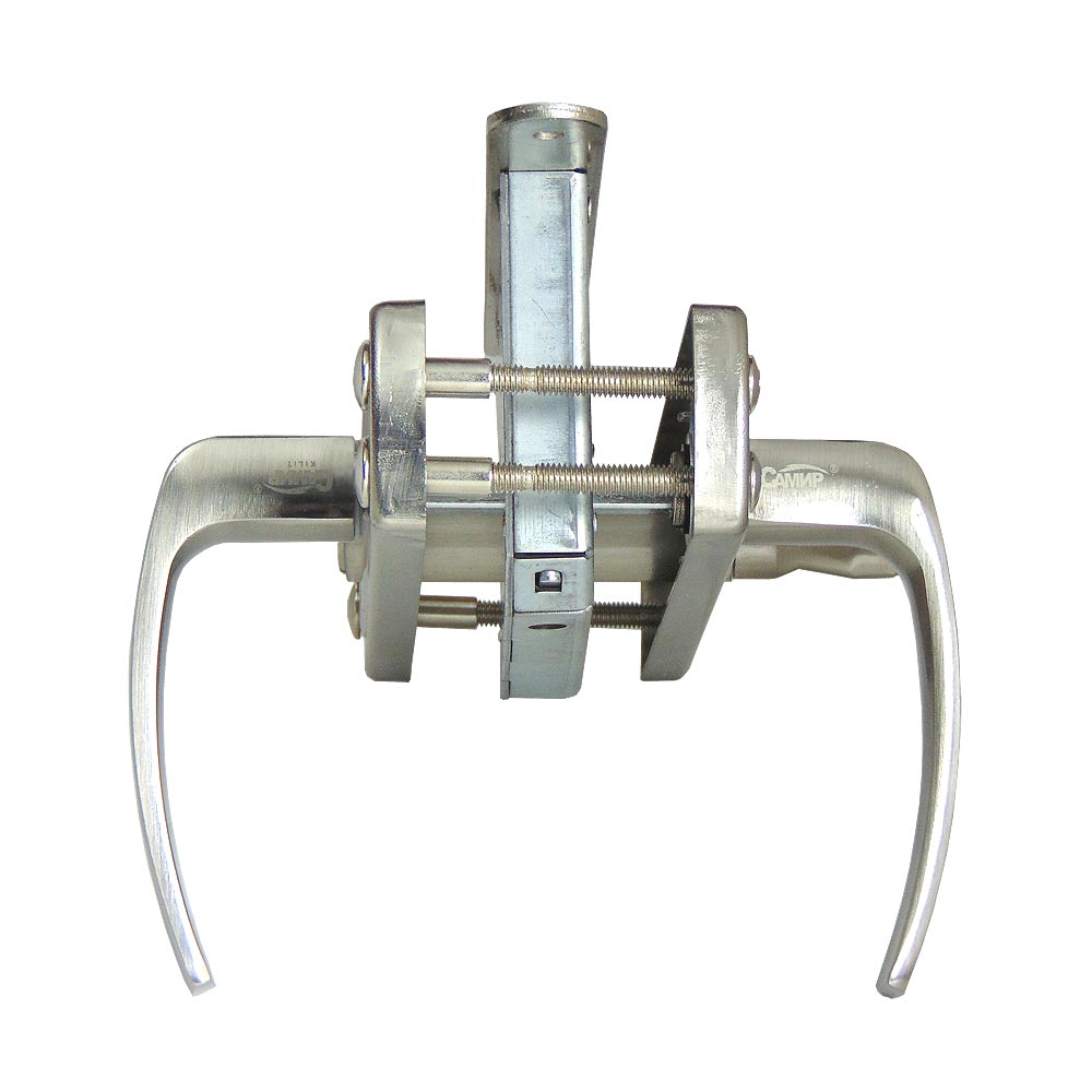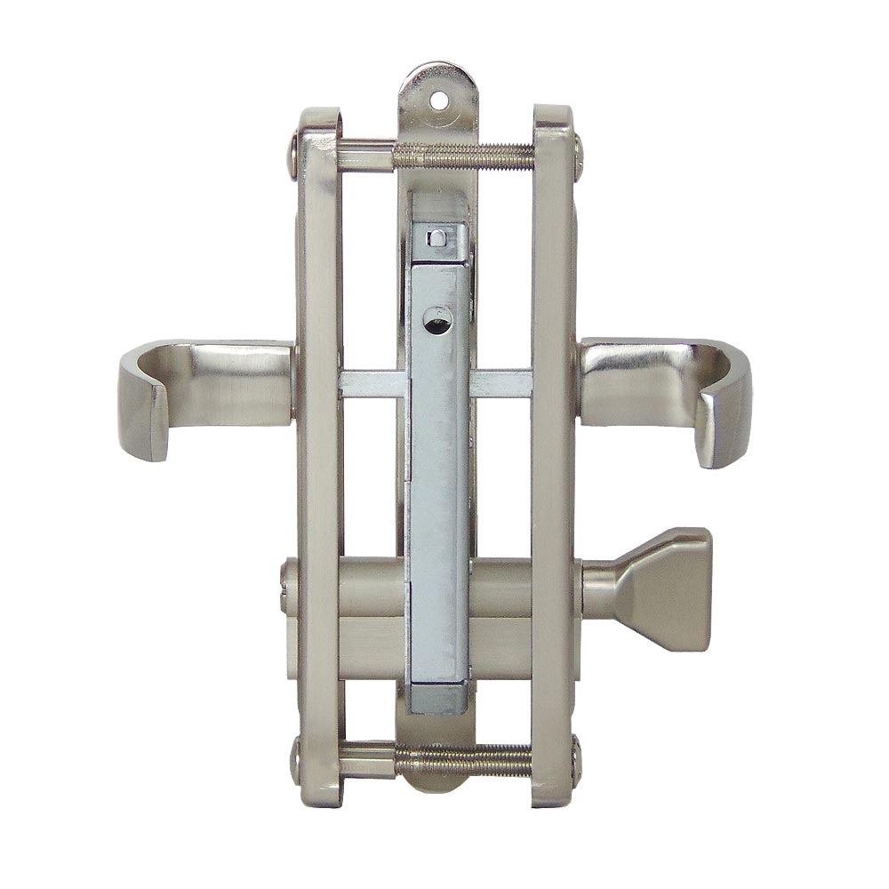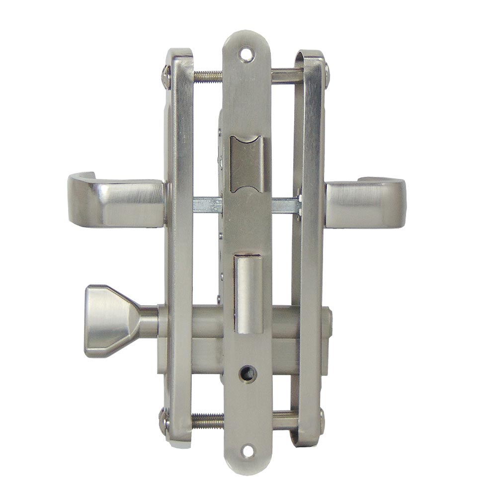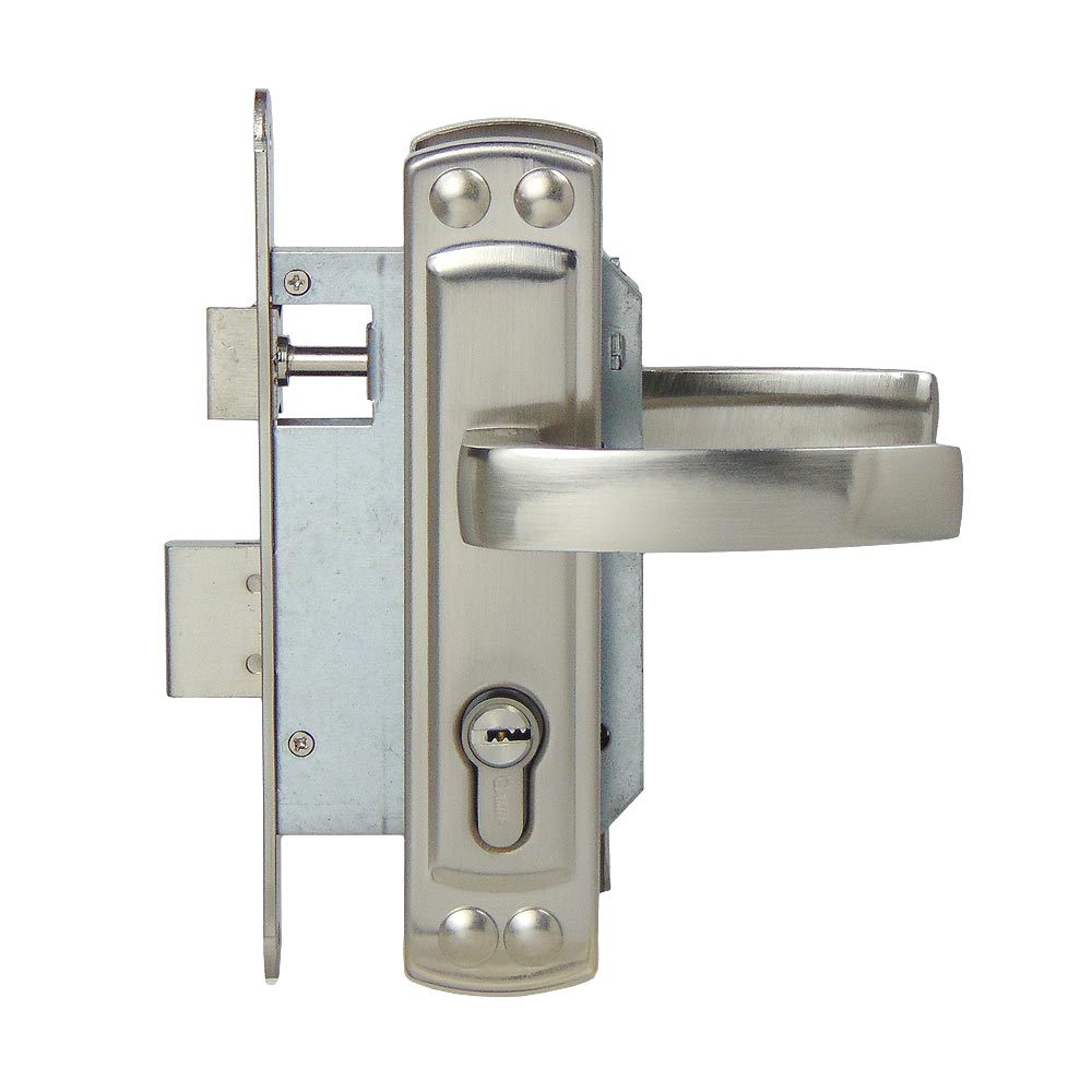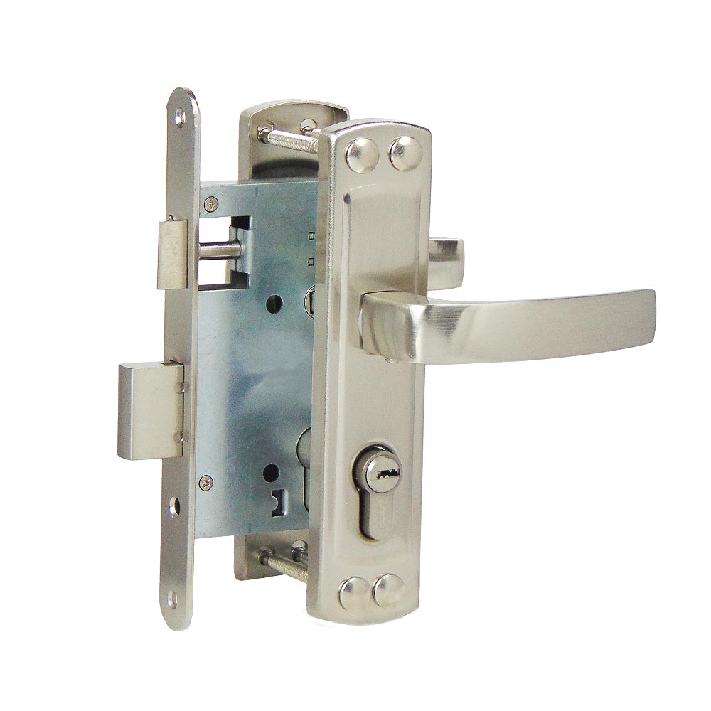 Замок врезной цилиндровый с верхней реверсивной защелкой и фалевыми ручками универсальный. Цилиндрового механизма в комплекте нет.