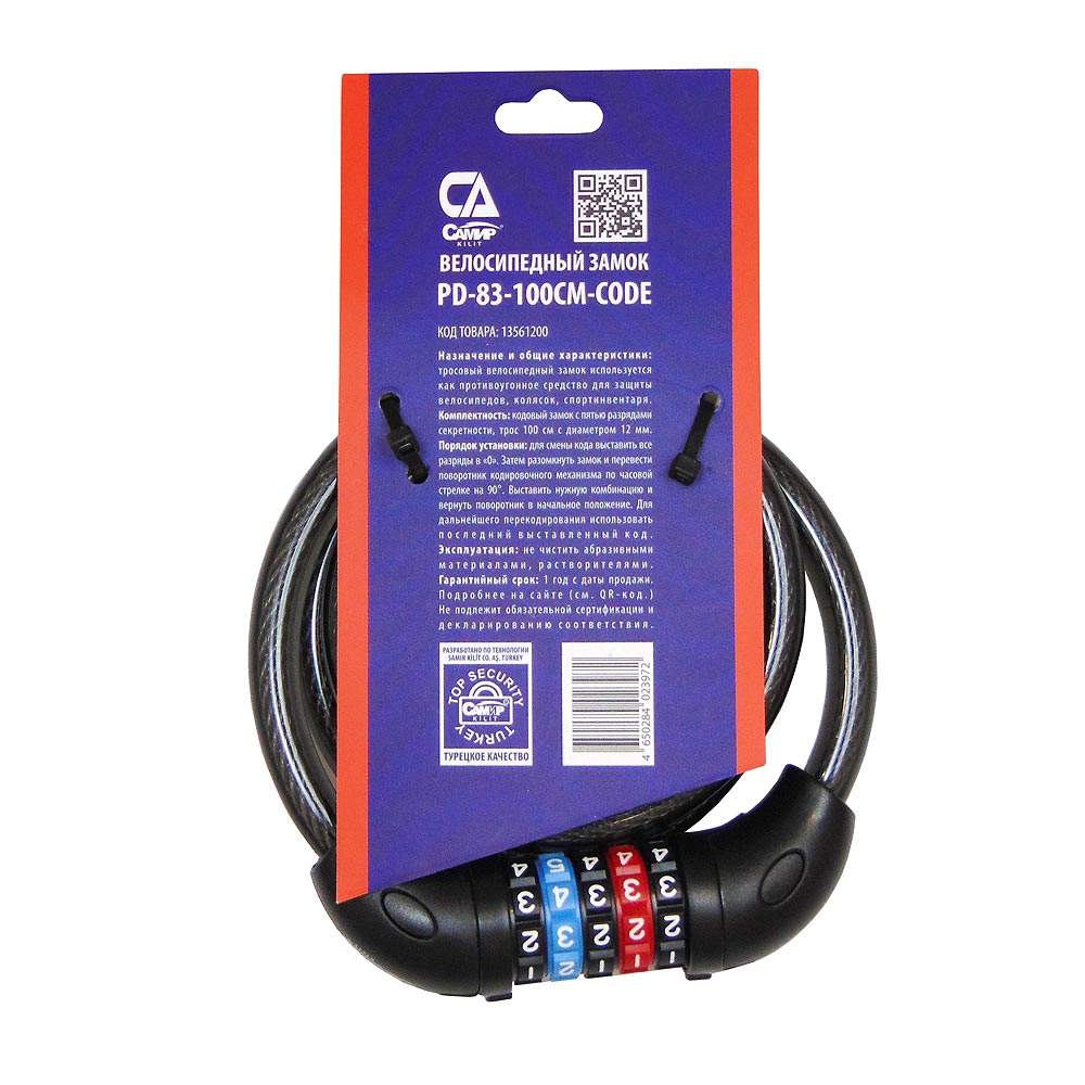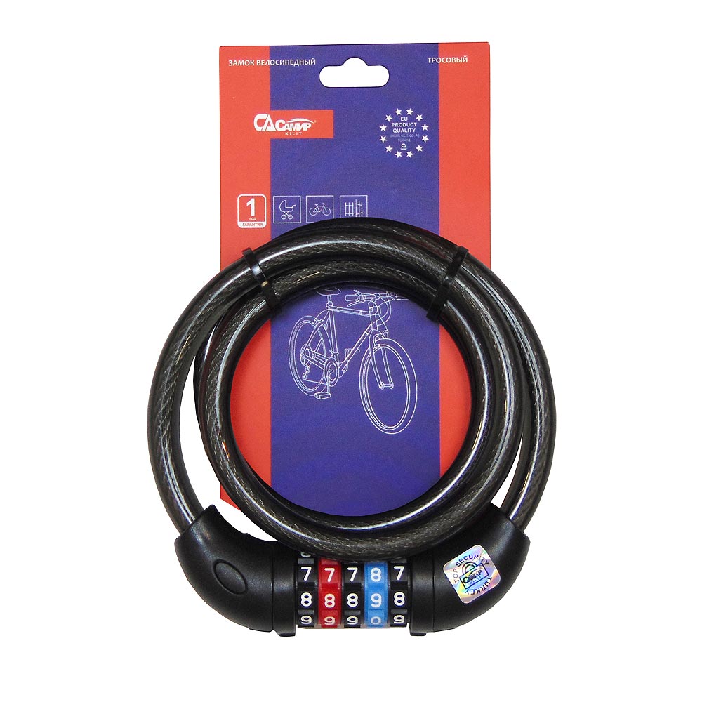 Велосипедный, с большим кодовым замком (5 разрядов), длина троса - 100 см, толщина троса - 12 мм. Габариты коробки (10 штук): 310мм х 150мм х 160мм. Вес брутто одного замка: 328 г.